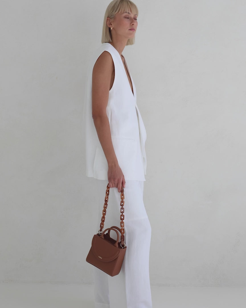 Mała, sztywna torebka wykonana z włoskiej, groszkowej skóry bydlęcej w kolorze karmelowym. Jedna komora zamykana na magnes, wykończona czarną podszewką. Zapinana na zatrzaski przednia klapa. Wewnętrzna mała, skórzana kieszonka.